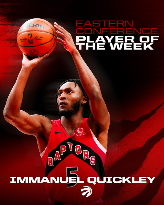 过去一周,奎克利帮助猛龙打出4胜0负的战绩,场均贡献25.3分6.8篮板,投篮命中率高达61.1%。