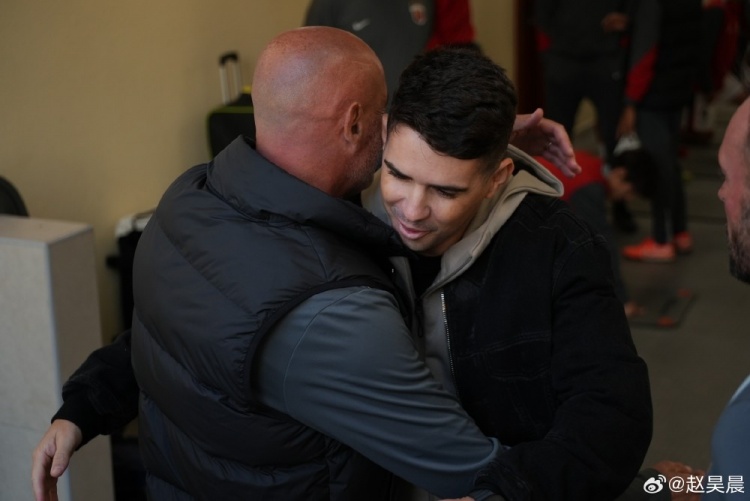 赵昊晨在社媒晒出了奥斯卡赛前与穆斯卡特打招呼的合影以及热身赛照,并配文写道:“奥斯卡携家人度假途径多哈,过来看看老朋友们。”